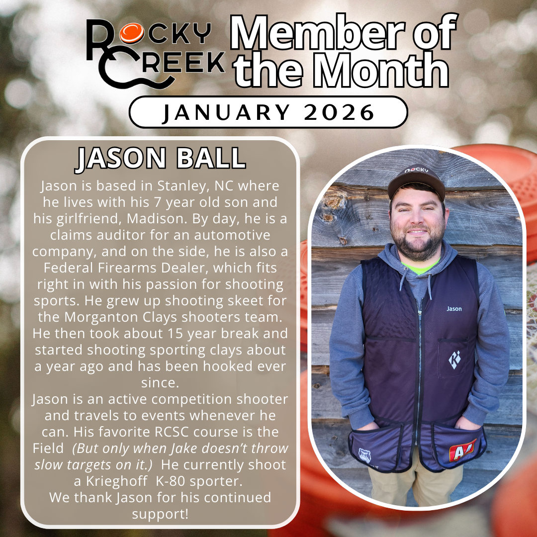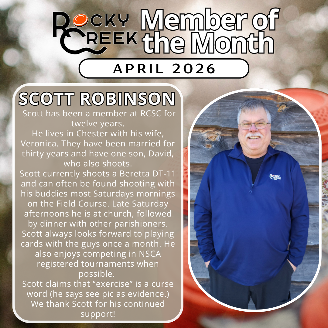 Ken got his first shotgun, a Savage 410, for Christmas when he was about twelve years old. He spent time shooting targets and bird hunting with his dad. After graduating from college, he became interested in skeet shooting. In 1993 he moved to Rock Hill and was introduced to sporting clays through local fundraisers. Ken loves being a member at Rocky Creek and all the people he has met there over the years. He enjoys shooting with his friends Charlie and Tom and especially his nephew Bryan that he introduced to sporting clays last year. Ken enjoys bringing new people to the sport and helping them develop their skills. His favorite gun for sporting clays is his Browning Citori, but he still has that 410 and recently shot it at Rocky Creek.